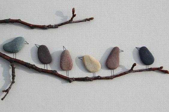 Для такой аппликации из камней понадобится шесть небольших деталей овальной или треугольной формы. Это будут тела птиц. Также пригодятся две веточки потолще, с расположенными на них тонкими и маленькими. Толстые крепятся проволокой, а мелкие торчат в стороны. Так картине добавляется объемность.
