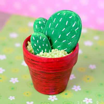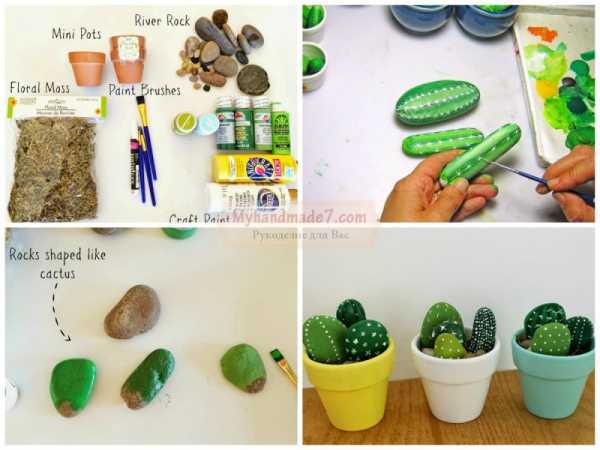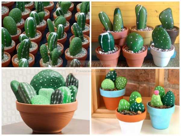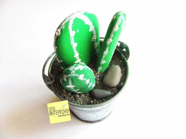Вот, например, комнатные растения — куда же без них? Они наполняют наш дом своим теплом и свежестью, но, к сожалению, не у всех есть возможность выращивать их дома, часто от неправильного ухода они засыхают. Теперь вам на помощь придут два простых материала — камни и зеленая краска, а в результате дома вы сможете вырастить целый кактусовый сад. Выглядят такие поделки из морских камней «Каменные кактусы» невероятно стильно и привлекательно, они смогут дополнить любой интерьер, их даже можно отнести в офис и поставить на свой рабочий стол. Вам надо подобрать морские камушки плоские и продолговатые, а затем окрасить их в зеленый цвет, выполнив белые черточки-иголочки, а детям можно предложить сделать маленькие иголочки из спичек и закрепить их на кусочки пластилина. А готовые кактусы можно легко закрепить в цветочной горшке, наполненном мелкой галькой.