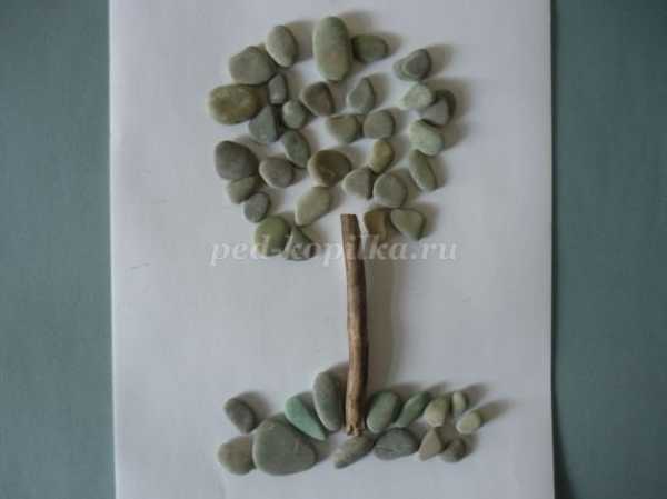 Вот еще один вариант аппликации из камней. При помощи несложных действий своими руками может получиться очень красивое дерево для детей.