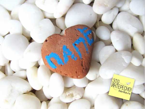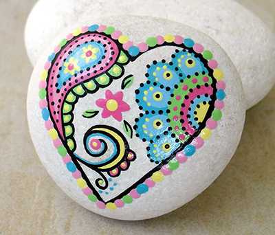 На гладкой гальке можно нарисовать очень красивые узоры. Хорошо для этого подойдут акриловые краски или лак. Можно нарисовать изящное сердечко.