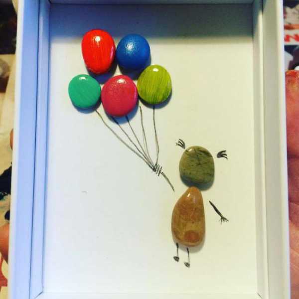 Воздушные шары можно раскрасить, а можно и оставить в натуральном виде. Дальше остается правильно разместить их сначала без клея и прорисовать остальные детали. Это руки, ноги и хвостики на голове у девочки. А для шариков — нитки, за которых их удерживает персонаж картинки. Дальше камни намазывают клеем и приклеивают на уже подготовленные места. Такую аппликацию из камней на картоне можно вставить в рамку и повесить в детской комнате. Она очень позитивная и будет поднимать ребенку настроение по утрам.