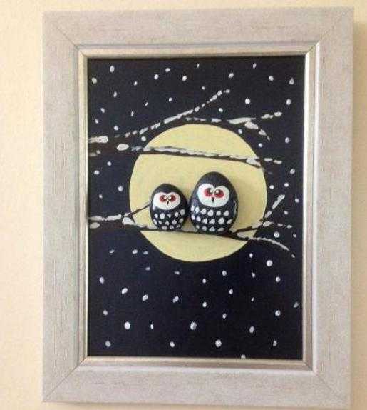 Остается работа над камнями. Их сначала раскрашивают, делая черный фон и рисуя сову. Потом после высыхания покрывают лаком. Теперь можно их садить на ветку. Аппликация из камней, своими руками сделанная, готова!