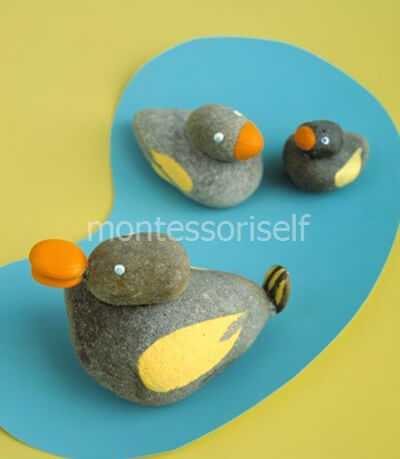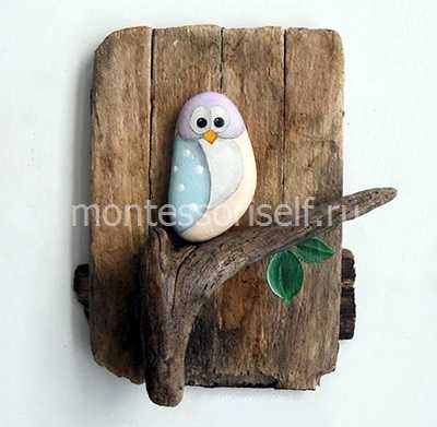 Камни-птицы размещаются не на самой ветке, а выше. Оставляют место для нарисованных краской или маркером лапок. Элементы размещать нужно утолщенной стороной вниз, по подобию строения птицы. Остается нарисовать клювы. При желании ребенок может добавить еще мелких деталей, нарисовав крылья, глаза, раскрасив перья. Такая аппликация из камней для детей будет несложной. Можно ее делать даже с 3-4-летними ребятами.