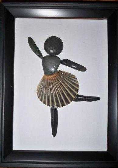 Чтобы сделать танцующую балерину, нужно подобрать круглый камень для головы, конусный для туловища, большую ракушку, которая будет изображать пышную пачку балерины. Для изображения рук и ног понадобится 4 удлиненных и тонких элемента.