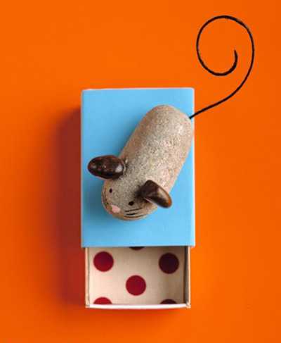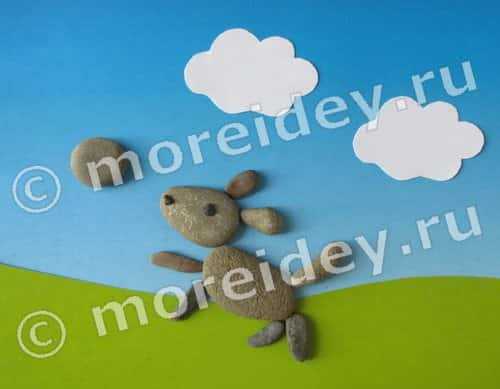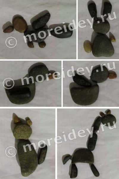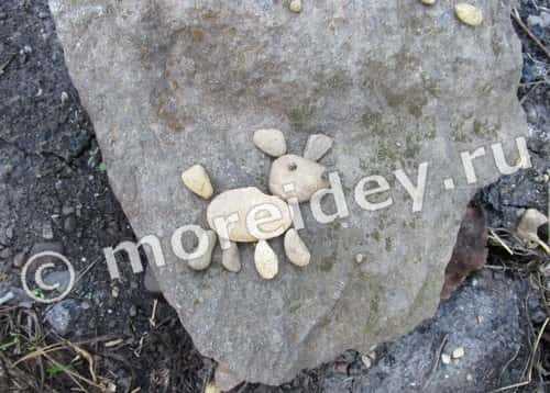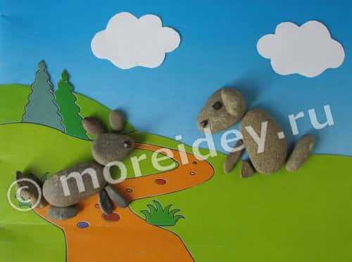 - На улице нашли подходящие камни: овальный для туловища, слегка заостренный для мордочки, маленькие камни длинной формы для лап, хвоста, ушей. Крошечные черные камешки для глаза и носа.