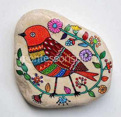 Вы можете выполнить и такие поделки из камней своими руками, фото которых больше напоминает произведение искусства, но здесь вам не обойтись без художественных навыков. Вы знаете, как сейчас популярны раскраски «антистресс», и именно такой рисунок вы можете нанести на плоскую каменную поверхность, а затем разукрасить их цветными красками, пользуясь тонкой кисточкой.