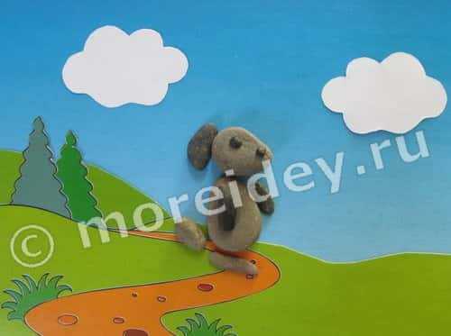 - Из цветной бумаги и обратной стороны картонной папки от этой же бумаги сделали фон (небо, траву), из белой бумаги вырезали облака. Расположили фигурки собачек на этом фоне.