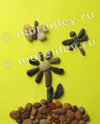Детям можно предложить каменную аппликацию, которая выполняется также просто, как другие поделки с натуральными материалами, например, аппликации из листьев или крупы. Для аппликации надо подготовить толстый лист гофрированного картона (упаковка от бытовой техники) и клей ПВХ, который позволяет надежно фиксировать камушки на картонной поверхности. Такими могут быть и поделки из ракушек и камней, где ракушки вам помогут создать цветочную композицию, а с помощью мелкой гальки можно выложить оригинальное обрамление для картины.