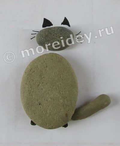 Такая сюжетная картинка имеет много деталей. Все они разного размера. Придется постараться, чтобы найти такие своеобразные камушки. Туловища котов продолговатые и утолщаются книзу. Головы закругленные, овальные. Для ушей нужны маленькие и заостренные на концах камни.