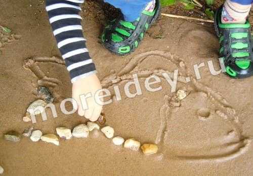 Вот тут-то ребенок с большим удовольствием выкладывал камнями рисунки, которые потом было не жалко разобрать и выложить новый узор. А секрет состоит в том, что рисунок нужно заранее прочертить палочкой или пальцем на влажном песке (это делает взрослый). Вот такая незамысловатая раскраска!»
