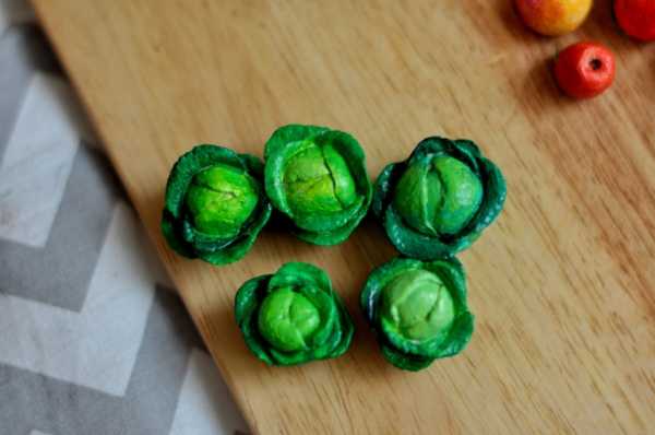 3) Капуста. Изготовить капусту очень просто — нужно скатать шарик и зубочисткой нанести рельеф