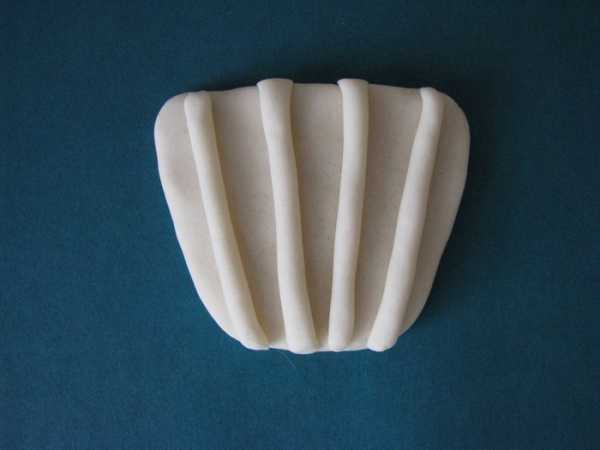 Прикрепить ручку к корзине. Вылепить нижний кант корзины (таким же способом, как и ручку) из меньшего по размеру жгута. Прикрепить его. Вылепить и закрепить на корзине вертикально 3 тонких жгутика.
