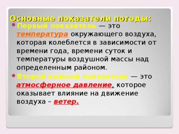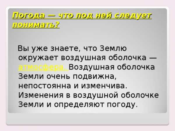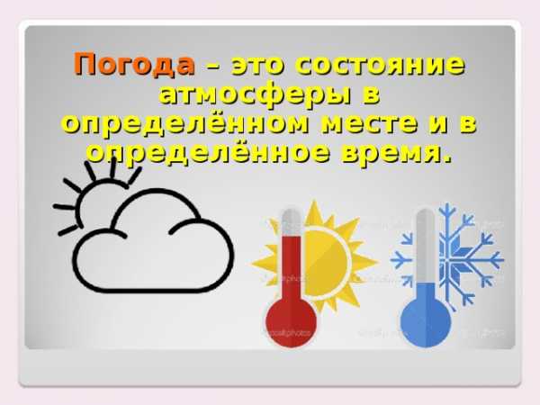 Погода – это состояние атмосферы в определённом месте и в определённое время.