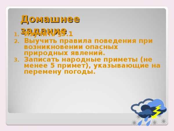 - Выучить правила поведения при возникновении опасных природных явлений.