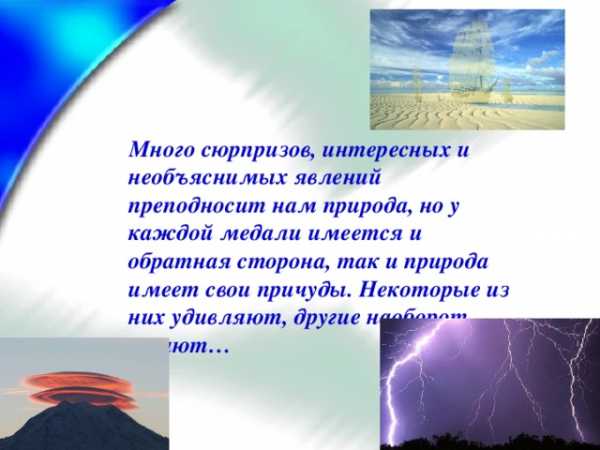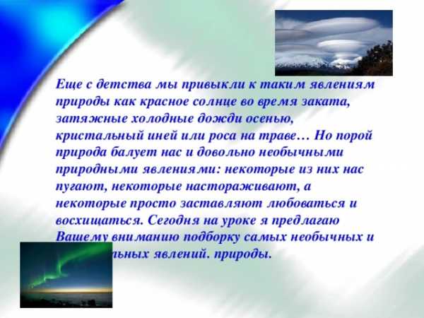 Еще с детства мы привыкли к таким явлениям природы как красное солнце во время заката, затяжные холодные дожди осенью, кристальный иней или роса на траве… Но порой природа балует нас и довольно необычными природными явлениями: некоторые из них нас пугают, некоторые настораживают, а некоторые просто заставляют любоваться и восхищаться. Сегодня на уроке я предлагаю Вашему вниманию подборку самых необычных и удивительных явлений. природы.