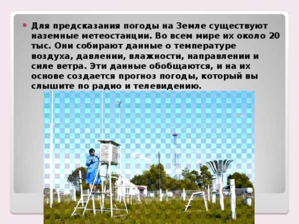 - Для предсказания погоды на Земле существуют наземные метеостанции. Во всем мире их около 20 тыс. Они собирают данные о температуре воздуха, давлении, влажности, направлении и силе ветра. Эти данные обобщаются, и на их основе создается прогноз погоды, который вы слышите по радио и телевидению.