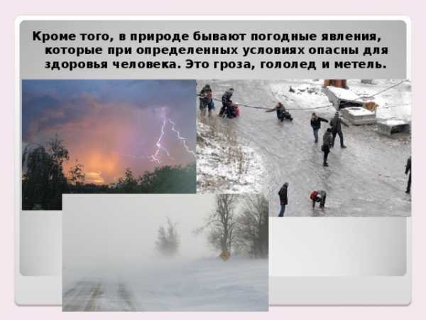 Кроме того, в природе бывают погодные явления, которые при определенных условиях опасны для здоровья человека. Это гроза, гололед и метель.