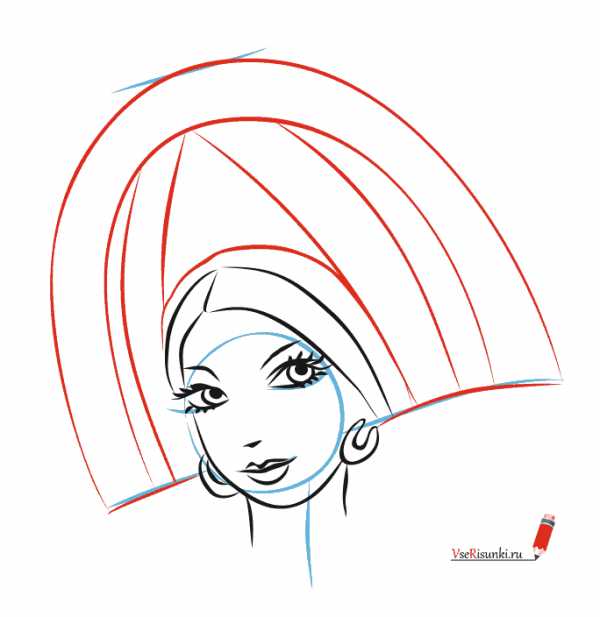 Этап 4. По голове вверху делаем кокошник — русский национальный головной убор. Его могли носить только незамужние девушки. Он рисуется между линиями из этапа 1. Кокошник довольно большой. Представляет собой как бы полукруг. На нем несколько черт, между которыми будут располагаться узоры.